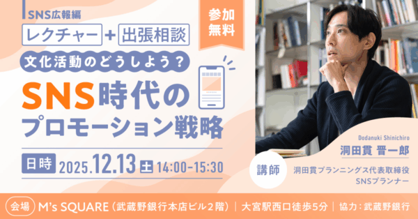 レクチャー+出張相談(SNS広報編)(2025/12/13|埼玉) 日時:2025年12月13日 (土) 14:00~15:30 会場:M’s SQUARE(エムズスクエア)武蔵野銀行本店ビル2階(埼玉県さいたま市大宮区桜木町1-10-8) 参加費:無料 詳細・申込:https://artscouncil-saitama.jp/programs/lecture3/ …続きを読む 2025年12月1日 / 最終更新日時 : 2025年12月1日 学芸出版社 イベント案内