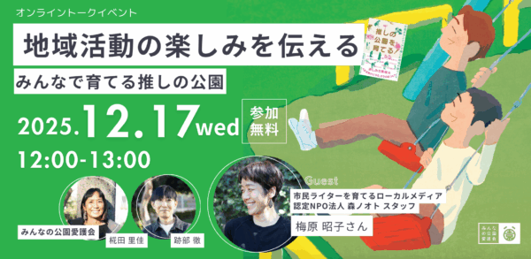 地域活動の楽しみを伝える!みんなで育てる推しの公園(2025/12/17|オンライン) 日時:2025年12月17日(水) 12:00〜13:00 会場:オンライン(GoogleMeet お申し込みいただいた方にURLをお送りします) 参加費:無料 詳細・申込:https://parkfriends251217.peatix.com/?fbclid=IwY2xjawOWJl9leHRu…続きを読む 2025年12月1日 / 最終更新日時 : 2025年12月1日 学芸出版社 イベント案内