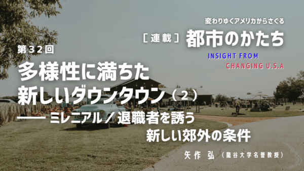 第32回「多様性に満ちた新しいダウンタウン(2)―― ミレニアル/退職者を誘う新しい郊外の条件」連載『変わりゆくアメリカからさぐる都市のかたち』 アメリカで新しいダウンタウンづくりが始まっています。多様な都市機能が混在し、土地利用が複合型のダウンタウンを創る動きです。コロナ禍下、さらにはその後もリモートワーク/在宅勤務が普及しました。働き方/暮らし方が変わったことが、「都市/郊外の「かたち」」に変化を引き起こしました(矢作弘他『コロナで都市は変わるか――欧米からの報告』2020年 学芸出版社)。 2025年11月27日 / 最終更新日時 : 2025年11月26日 学芸出版社 変わりゆくアメリカからさぐる都市のかたち
