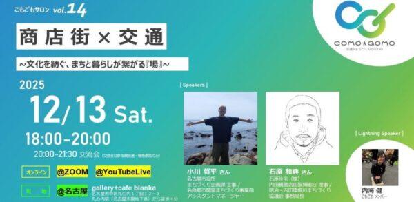 COMO×GOMO 「こもごもサロン vol. 14 ~商店街×交通~」(2025/12/13|愛知・オンライン) 日時:2025年12月13日 (土) 18:00~20:00 (その後オンサイト参加者のみで1時間半程度交流会を予定) 会場:愛知・名古屋 @gallery+cafe blanka(〒460-0002 愛知県名古屋市中区丸の内1丁目12−3)/オンライン 参加費: オンサイト参加:2,500円(現地…続きを読む 2025年11月25日 / 最終更新日時 : 2025年11月25日 学芸出版社 イベント案内