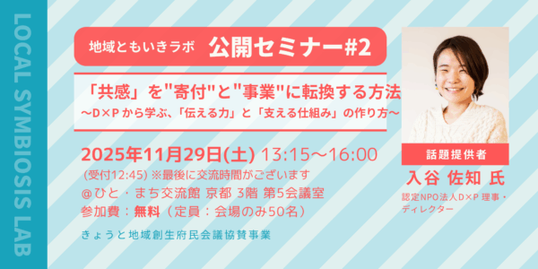 「共感」を”寄付”と”事業”に転換する方法 〜D×P から学ぶ、「伝える力」と「支える仕組み」の作り方〜(2025/11/29|京都) 日時:2025年11月29日(日)13:15〜16:00(受付12:45) 会場:ひと・まち交流館 3階 第5会議室(京都市下京区西木屋町通上ノ口上る梅湊町83番地の1) 参加費:無料(対面のみ 定員50名) 詳細・申込:https://forms.gle/Jkenfwp5o5CG5WDn8 内容 …続きを読む 2025年11月10日 / 最終更新日時 : 2025年11月10日 学芸出版社 イベント案内