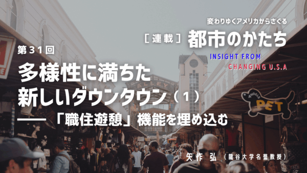 第31回「多様性に満ちた新しいダウンタウン(1)―― 「職住遊憩」機能を埋め込む」連載『変わりゆくアメリカからさぐる都市のかたち』 アメリカで新しいダウンタウンづくりが始まっています。多様な都市機能が混在し、土地利用が複合型のダウンタウンを創る動きです。コロナ禍下、さらにはその後もリモートワーク/在宅勤務が普及しました。働き方/暮らし方が変わったことが、「都市/郊外の「かたち」」に変化を引き起こしました(矢作弘他『コロナで都市は変わるか――欧米からの報告』2020年 学芸出版社)。 2025年10月31日 / 最終更新日時 : 2025年10月31日 学芸出版社 変わりゆくアメリカからさぐる都市のかたち