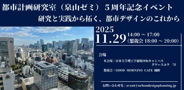 「都市計画研究室(泉山ゼミ)5周年記念イベント」 ー研究と実践から拓く、都市デザインのこれからー(2025/11/29|東京・オンライン) 日時:2025年11月29日 14:00~17:00(懇親会:18:00-20:00) 受付締切 懇親会参加の場合:2025年11月23日(日)23:59まで 一般参加(会場・オンライン)のみの場合2025年11月28日(金)18:00まで 会場:日本大学理工学部駿河台キャンパスタワースコラ7F(東…続きを読む 2025年11月21日 / 最終更新日時 : 2025年11月21日 学芸出版社 イベント案内