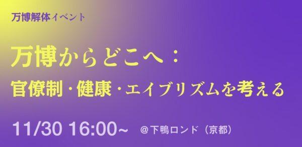 万博からどこへ:官僚制・健康・エイブリズムを考える(2025/11/30|京都) 日時:2025年11月30日(日) 16:00-20:00 会場:下鴨ロンド(住所非公開のため申し込みされた方にお送りします) 参加費: ①通常購入:イベントのみ(1,000円) ②通常購入:イベント+食事(2,500円) 定員:15名 詳細・申込:https://forms.gle/J9zL4Eh…続きを読む 2025年11月12日 / 最終更新日時 : 2025年11月12日 学芸出版社 イベント案内