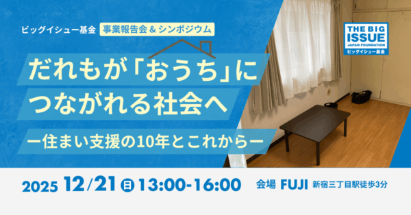 【支援現場から住宅政策を考える】だれもが「おうち」につながれる社会へー住まい支援の10年とこれからー(2025/12/21|東京) 日時:2025年12月21日(日)13:00~16:00 会場:セミナールームFUJI(東京都新宿区新宿5-15-14 INBOUND LEAGUE 2階) 参加費:1,000円(資料代として) 詳細・申込:https://bigissue-home-2512.peatix.com/ 内容 貧困問題…続きを読む 2025年11月10日 / 最終更新日時 : 2025年11月10日 学芸出版社 イベント案内