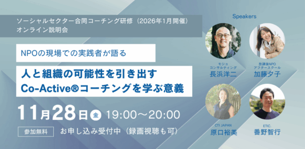 NPOの現場で活動するコーチが語る ~人と組織の可能性を引き出すCo-Active®コーチングを学ぶ意義(2025/11/28|オンライン) 日時:2025年11月28日(金)19:00〜20:00 会場:Zoomによるオンライン開催 参加費:無料 詳細・申込:https://peatix.com/event/4680602 内容 チームマネジメント、伴走支援、ステークホルダーとの対話…。 ソーシャルセクターの現場は、常に「人」に対する深…続きを読む 2025年11月14日 / 最終更新日時 : 2025年11月14日 学芸出版社 イベント案内