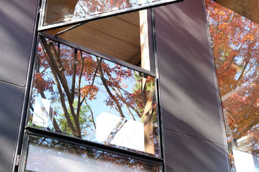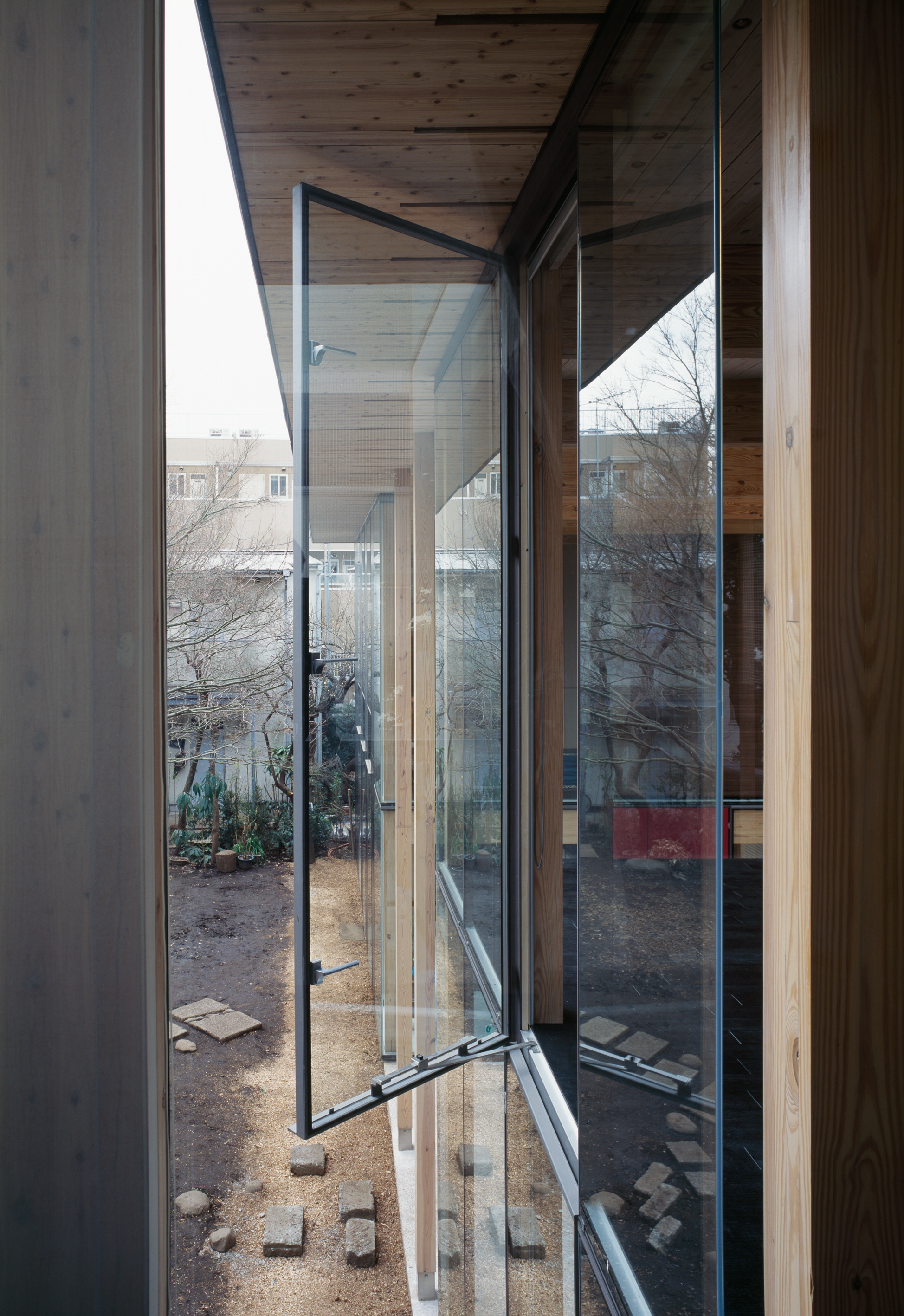 見所は、外壁面とフラットに納まるように、框と一体でつくられたステンレス削り出しのヒンジや、框の見込みを抑えるために8mm厚の強化ガラスを構造シール止めで仕上げるなど、非常に高い施工精度を要求するサッシワークが行われている点である。上下階のサッシが連続するように、水切りと霧除けを兼ねた枠や、開閉用のカムラッチハンドルの納まりも考え抜かれている。これらはまさに「間戸」として、構造体そして壁の間に穿たれた「間」と、内部と外部を仕切る境界面としての「戸」が、寸分の狂いも許さないディテールによって生み出されている。