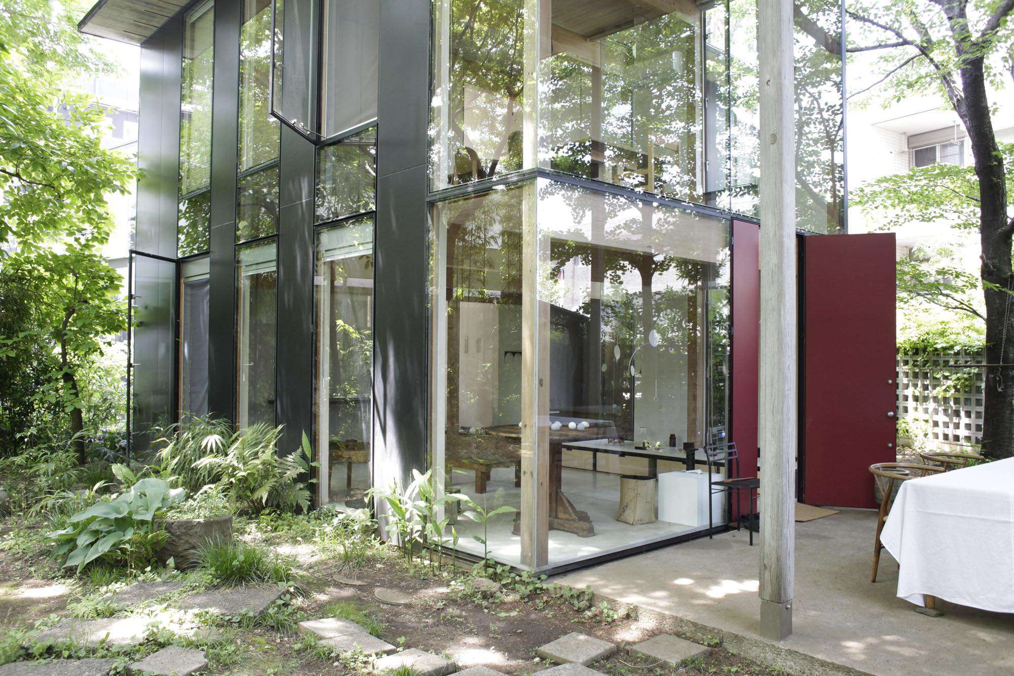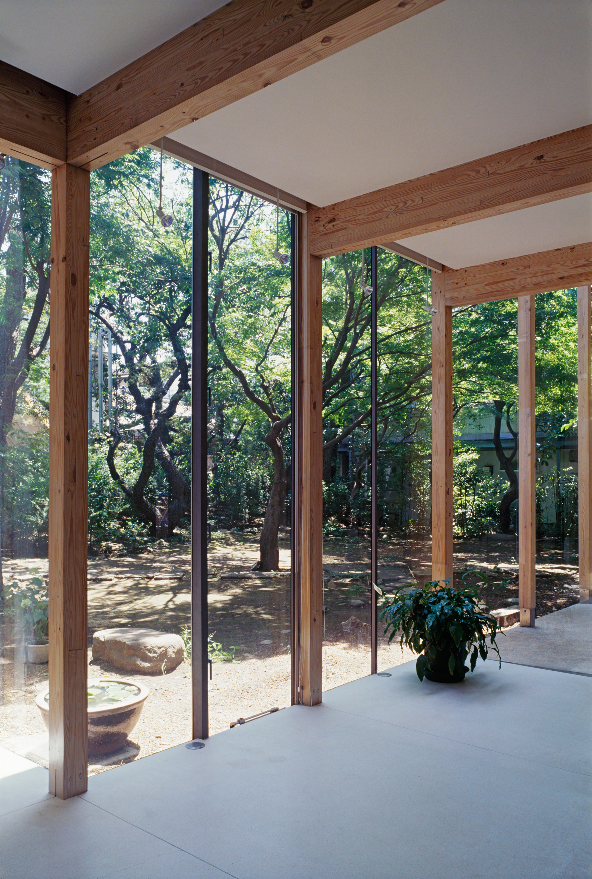 この住宅は、構造体と床・壁・屋根そして開口部だけでほとんど出来ている。梁間4500mm・桁行1800mmピッチの連続した門型フレーム、および2階床と屋根には奥多摩の間伐材を利用した編成材が用いられている。その中で、特徴的なのは「間戸」となる開口部だ。枠はスチール、框はステンレスの製作サッシで、低いもので2.5m、高いところで上下階連続した6m近くの、住宅とは思えないスケールのサッシが実現されている。