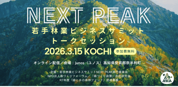若手林業ビジネスサミットNEXT PEAK トークセッション(2026/03/15|高知・オンライン) 日時:2026/3/15 (日) 13:30 – 16:00 会場:ゲストハウスjunos(高知県安芸郡奈半利町乙2652-4)/オンライン 参加費: 一般:無料 一般(配信会場にて参加):無料 森づくりフォーラム会員になって参加:¥3000 森づくりフォーラム会員になって参加(配信会場…続きを読む 2026年2月16日 / 最終更新日時 : 2026年2月16日 学芸出版社 イベント案内