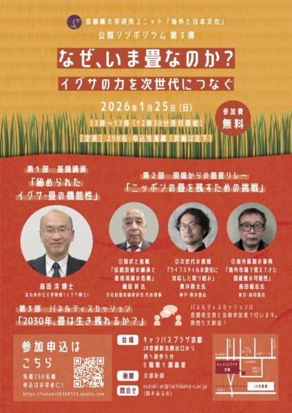 なぜ、いま畳なのか? ~イグサの力を次世代につなぐ~(2026/01/25|京都) 日時:2026年1月25日(日) 13:00~17:00(開場12:30) 会場:キャンパスプラザ京都(JR京都駅徒歩5分)(京都府京都市下京区東塩小路町939) 参加費:無料 詳細・申込:https://tatami20260125.peatix.com 内容 インフルエンザ等の感染症や受験シーズ…続きを読む 2026年1月14日 / 最終更新日時 : 2026年1月14日 学芸出版社 イベント案内