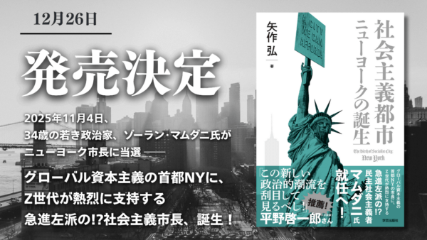 12月26日 発売決定・予約受付中『社会主義都市ニューヨークの誕生』――2025年11月4日、34歳の若き政治家、ゾーラン・マムダニ氏がニューヨーク市長に当選 2025年11月4日、ニューヨーク市(NYC)の市長選で、34歳の若き民主社会主義者、ゾーラン・マムダニ氏が当選しました。 当初は無名候補ながら、民主党予備選では前州知事として圧倒的な知名度・資金力を持つA・クオモ氏を打ち破り、党の公認候補に。本選でも激戦の末に勝利。生活に苦しむZ世代・ミレニアル世…続きを読む 2025年11月5日 / 最終更新日時 : 2025年12月15日 学芸出版社 学芸出版社からのお知らせ