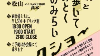 日時:2025/10/17(FRI)18:30 OPEN/19:00 START/21:00 CLOSE 会場:森(「今治ホホホ座」別館)(住所:愛媛県今治市米屋町4丁目2-1) 日時:2025/10/18(SAT)18:30 OPEN/19:00 START/21:00 CLOSE 会場:めしSA…続きを読む
