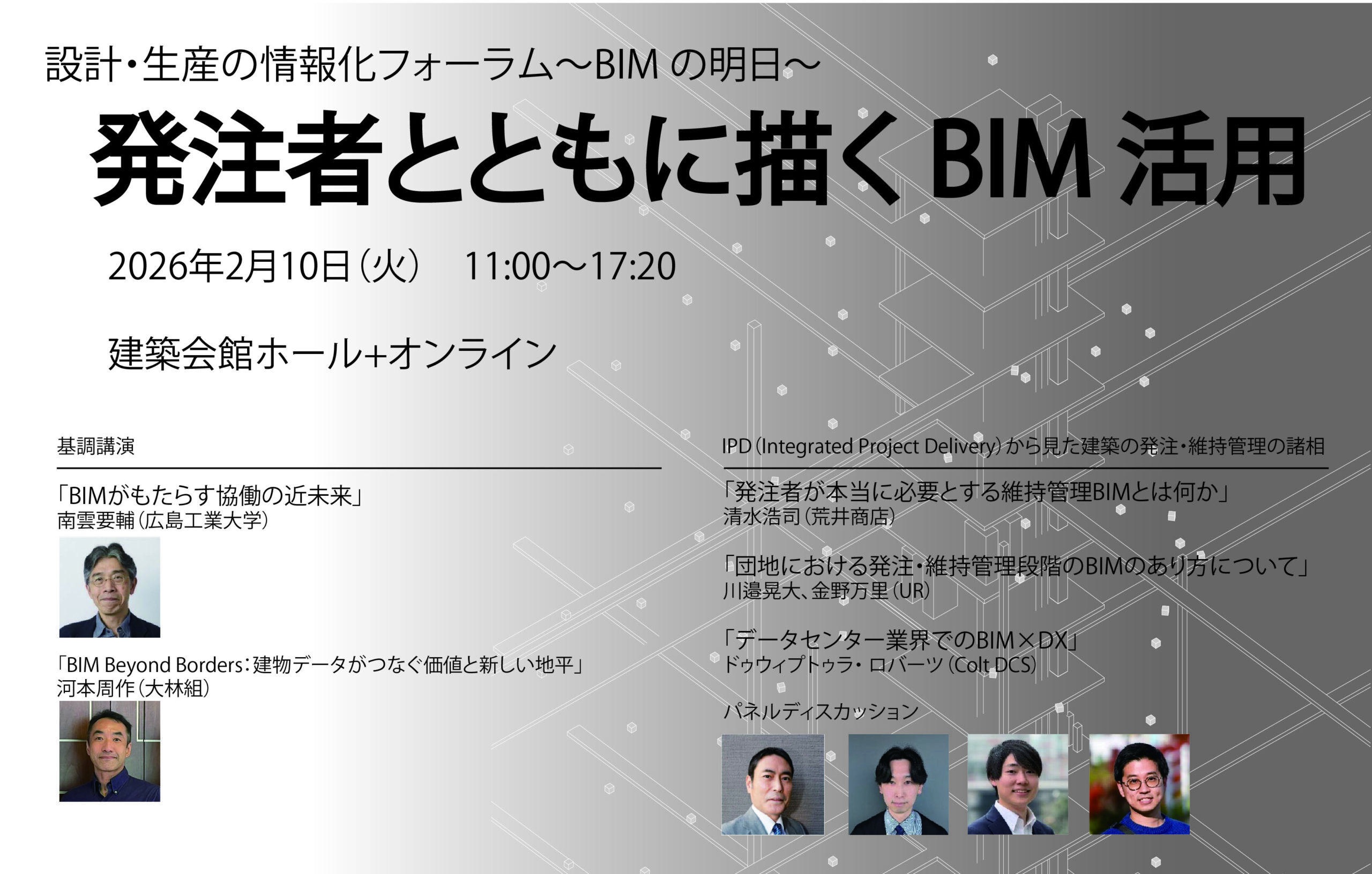 第2回となる設計・生産の情報化フォーラムでは、「発注者とともに描くBIM活用」を主題とし、デジタルデータを用いた建設業務の企画から発注、さらに完成建物の維持管理等への取り組みや現状の報告を踏まえ、データが拡張する建築行為の未来を考えるフォーラムを開催する。パネルディスカッションを行い、建築発注者・建物管理者など様々な立場から捉えた今後のデジタルデータの在り方について議論する。小委員会傘下のWGの活動報告は、報告に適した活動時期を迎えたWGが行う。
