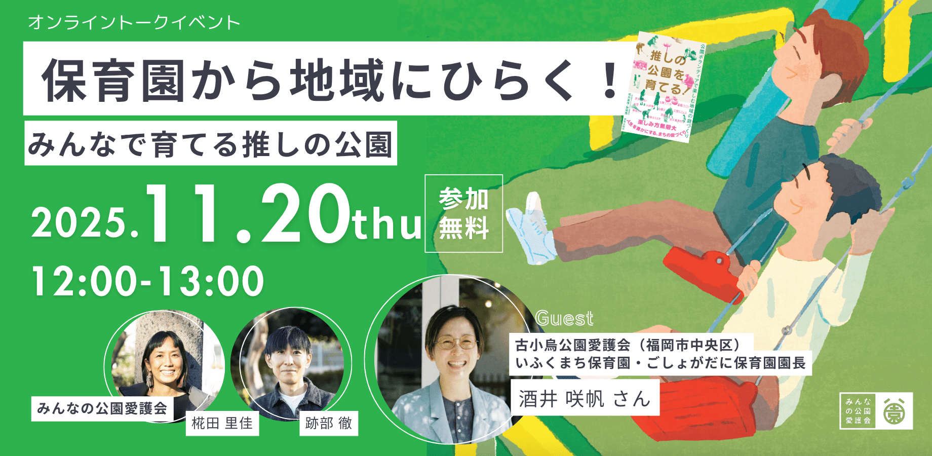 今回のゲストは、福岡市中央区の古小烏公園愛護会の酒井咲帆さん。地域で写真館を営みながら、いふくまち保育園・ごしょがだに保育園という2つの保育園を立ち上げ、その保育園に隣接する公園の愛護会活動も行っている酒井さんに、保育園が公園愛護会をする良さや、地域にひらいたさまざまな活動や居場所づくり、子どもや大人も一緒に公園育てをする楽しみなどを伺います。