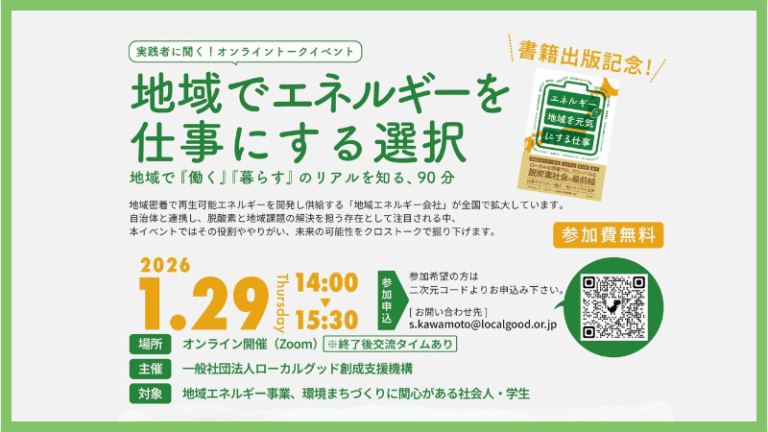 日時:2026年1月29日(木) 14:00〜15:30 会場:オンライン(Zoom)※事前申込制 参加費:無料 詳細・申込:https://localgood.or.jp/event/energy-job-event2/ 内容 地域密着で再生可能エネルギーを開発し地域に供給する「地域エネルギー会社…続きを読む