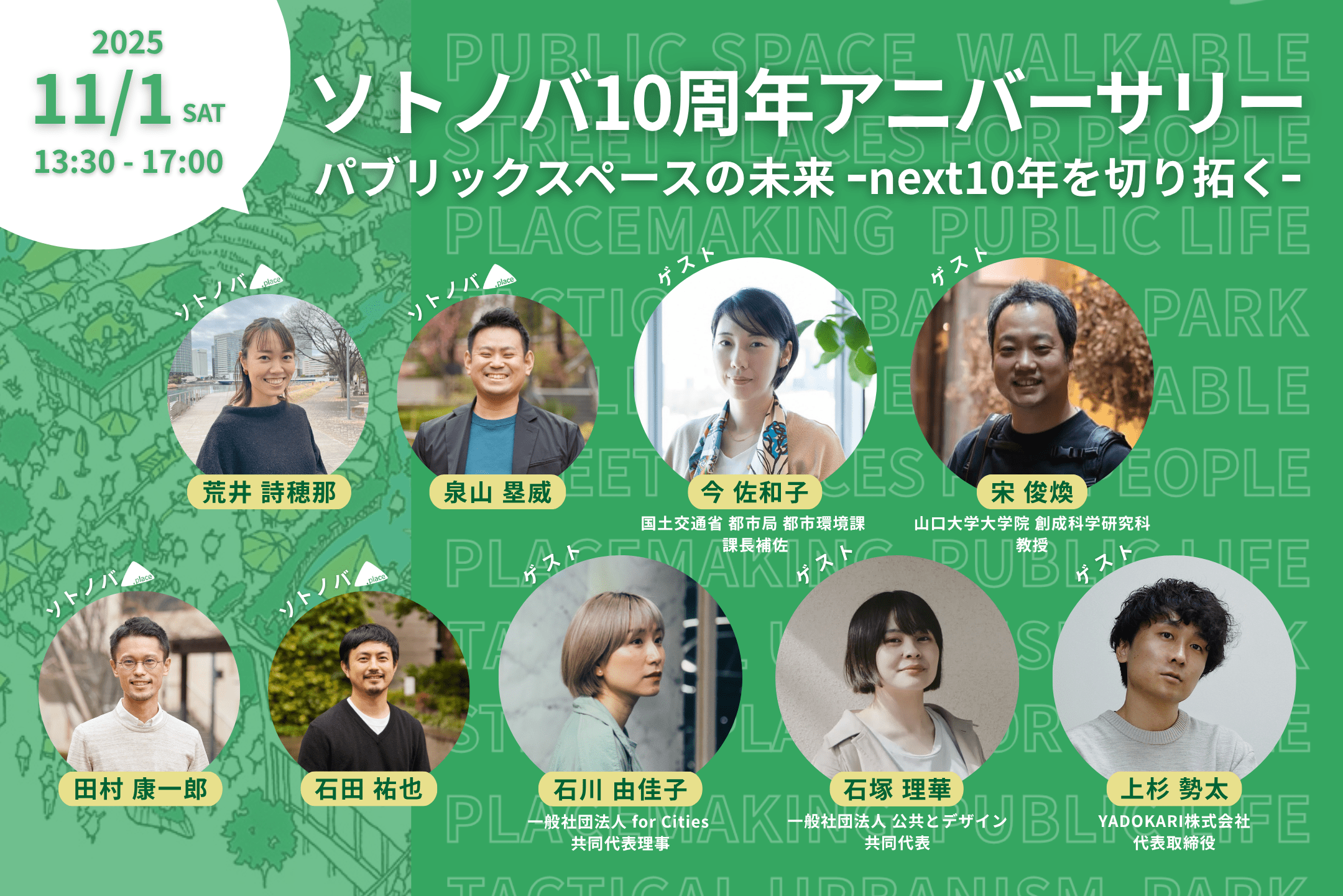 そこで、ソトノバ10周年を記念し、2025年11月1日(土)に「10周年アニバーサリー|パブリックスペースの未来 -next10年を切り拓く-」を開催します!