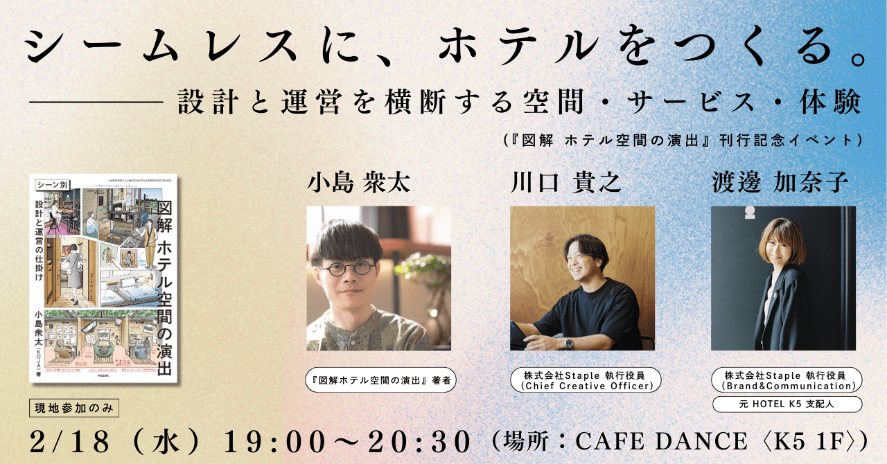 設計デザイン・開発を担当する川口貴之さん、元HOTEL K5支配人として開業から運営の現場に携った後、現在はブランド・コミュニケーション領域を担当する渡邊加奈子さんをお招きし、著者の小島衆太(KOJA)さんと共に「シームレスにホテルをつくること」について語り合います。
