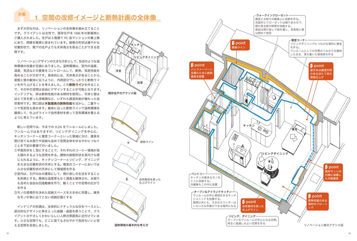 2部構成となっている本書ですが、まず1部では、これだけはおさえておきたい断熱の基礎知識を解説しています。なお、本文中強調太字で示す語句は、巻末の用語解説と対応しています。続く2部は実践編です。鉄筋コンクリート造集合住宅の「内断熱」、木造戸建ての「ゾーニング断熱」、鉄筋コンクリート造戸建ての「外断熱」という、三つの既存建築における断熱リノベーション(改修)事例を紹介しています。入門事例としても理解を助ける鉄筋コンクリート造集合住宅の断熱リノベーションは、インフィル設計全てを紹介します。当時の大工の技量が見え隠れする築80年の在来軸組工法木造住宅や築30年の打放しコンクリート造住宅では、その価値に敬意を払いながら継承しつつ、快適性の向上を試みています。このように、優良資産に生まれ変わる余地のある空き家は、日本全国に山ほど眠っています。