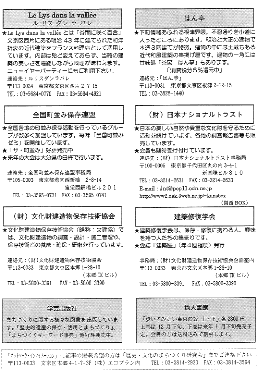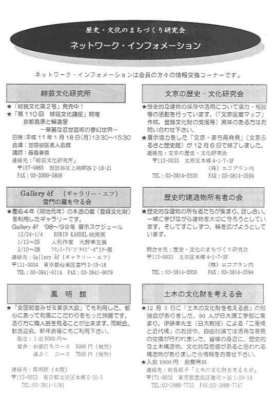 「歴史・文化のまちづくり研究会」では今後も様々なかたちで活動を進めていきますが、 その運営には会員の皆様のご協力が必要です。 以下の活動に協力していただける方を募集いたします。 活動は年に4〜6回です。 ぜひ当会までご連絡下さい。ネットワーク・インフォメーション