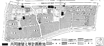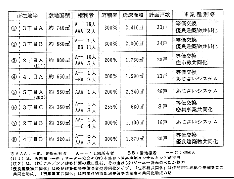 この計画は、 20人の権利者による共同建替え計画で、 残存家屋2軒の協力的参加が得られている点が特筆される。(2)3丁目B:地主1人と借地権者12人の共同建替え