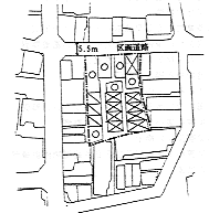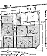 この計画敷地は、 幅員5.5mの区画道路に面するおもて宅地と幅員2m以下の2項道路にしか接しないうら宅地からなっており、 おもて宅地の協力による共同化計画が進められている。