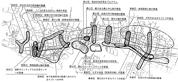 「第4章 市街地復興計画」では、 被災地を都心、 東部、 西部に分け、 それぞれの地域を復興するプロジェクトとして下図に示すものをあげている。