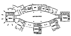 建物はレンガ色の平屋(建築面積約360m2)で、 内部は南側に6つの居室が並び、 幅広い廊下をはさんで北側に共用スペースがある。