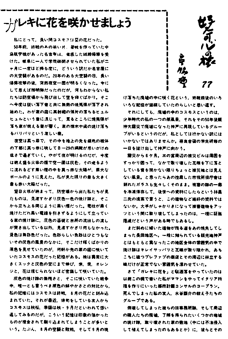 第1回目は、 建築家の宮脇檀さんの書かれた記事で、 ネットワークが取り組んでいる「ガレキに花を咲かせましょう」のプロジェクトに関する記事です。