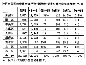 しかし長田区ではまだ70戸のみ!災害公営住宅の発注数を全壊+全焼家屋数で割ると、 東灘区・灘区・中央区は3〜4%台であるが、 長田区は0.4%と著しく低い水準である。