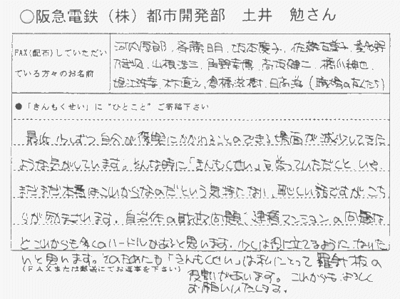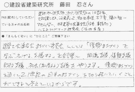 今回より、 こういった「きんもくせい」の配布にご尽力をいただいている都市計画関係の講座のある大学などを拠点としたファックスネットワークの方々や、 「きんもくせいネットワーク」、 その他の方々からのお便りを随時ご紹介します。