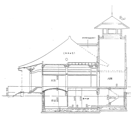 この寺の場合、 一部座敷・ホールの増築計画もあり、 土地の有効利用も考えて地下にそれらの増築部分を設けしっかりとした地下を基礎として木造本堂を元の位置に戻した。