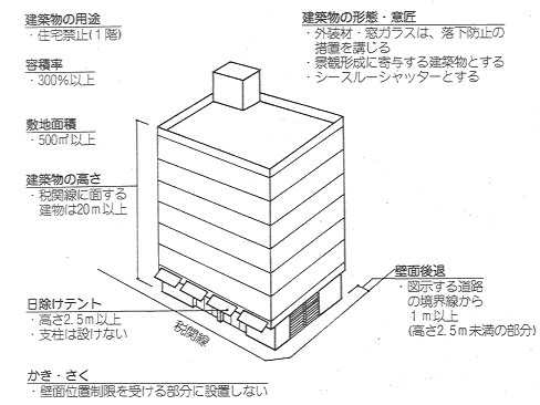 復興計画がまちの将来方向を設定したのに対して、 これを実現させるために、 ビルの新築や改築時、 あるいは管理上、 各々はどのような点に留意すべきかを整理・提案するものである。