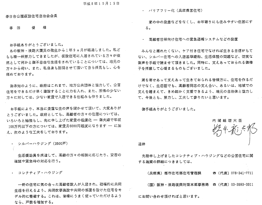 橋本首相から春田さんへの手紙