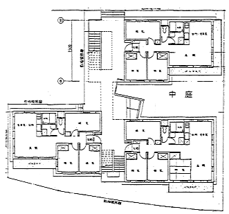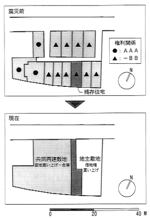 プロジェクトのフレームとしては、 1)残存建築はそのまま残して敷地内通路を引き込んで接道させる、 2)この残存建築を挟んで、 地主側と共同再建側に敷地に分割する、 3)地主側敷地の借地権は地主に売却し、 共同再建側の底地を買い取って権利関係をスッキリさせる、 4)地主は賃貸住宅を建て、 年金生活者に一代限りの低家賃で賃貸する、 という解決に至った。