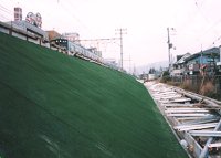土手の地盤を固めて、 全面をビニールの人工芝とやらで覆い、 その上を数センチ幅の金属棒で碁盤の目状に押さえている。