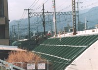 そばを歩くと住宅展示場の中に迷い込んだような気がするが、 JRの高い車窓から見ると、 その屋根は黒々とし、 テカテカと輝いている。