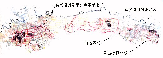 まちづくり協議会の結成についていえば、 都市計画事業地区では行政の支援も受けながらすべてのエリアで結成されてますが、 “白地区域”では住民の自主的なものに任されており、 震災後結成された100以上のまちづくり協議会のうち、 “白地区域”は数カ所にとどまっています。
