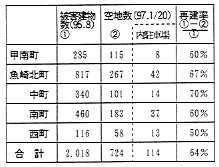 震災直後、 ボランティア団体が調べたデータによると、 地区内の60%強の建物が全壊あるいは半壊と判定されていた。 その後、 平成7年8月の調査では解体整地された敷地のうち、 再建に着手したものは10.8%であった。 それが12月の調査では35%を超え、 平成8年3月の調査ではほぼ50%に達していた。 しかし、 急速な復興はこの頃までで、 夏頃から変化が見えなくなり、 今年の1月末の調査では約64%であった。 つまり被災宅地のうち30%近くが更地として固定化しそうだと考えられる。