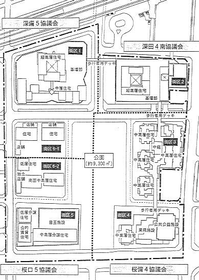 公園・道路の配置案が連合協議会で決定したとき、 公園の規模は概ね1haということであった。 各街区の施設配置計画と残存マンション住民意向により最終形を決めようとするものである。 3つのブロック協議会は、 これを念頭に役員会、 住民集会を繰り返し合意形式をはかっていった。 (1)合意形式(案の絞り込み)の方法