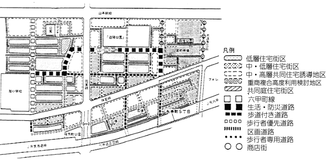 六甲道駅北地区(約16.1ha)は、 平成7年3月に土地区画整理事業の都市計画決定がなされた後、 何回かの市の説明会や「まちづくり協議会」発足の要請などを通じて、 地元に協議会立ち上げの機運が生じた。 元の自治会単位がベースになったために、 ひとつの事業地区内に8つの協議会ができることになり、 8月から11月にかけて順次発足した。 私達コンサルタントチームは、 協議会発足の準備段階から全面的に支援活動を行うことになったが、 神戸市の手先ではなく、 事業反対運動のためでもなく、 互いに協力して「希望する皆が、 一日も早くこのまちに戻れるために」働くということを常に表明し、 実際そのために頑張ったつもりである。 2.まちづくり構想提案と連合協議会
