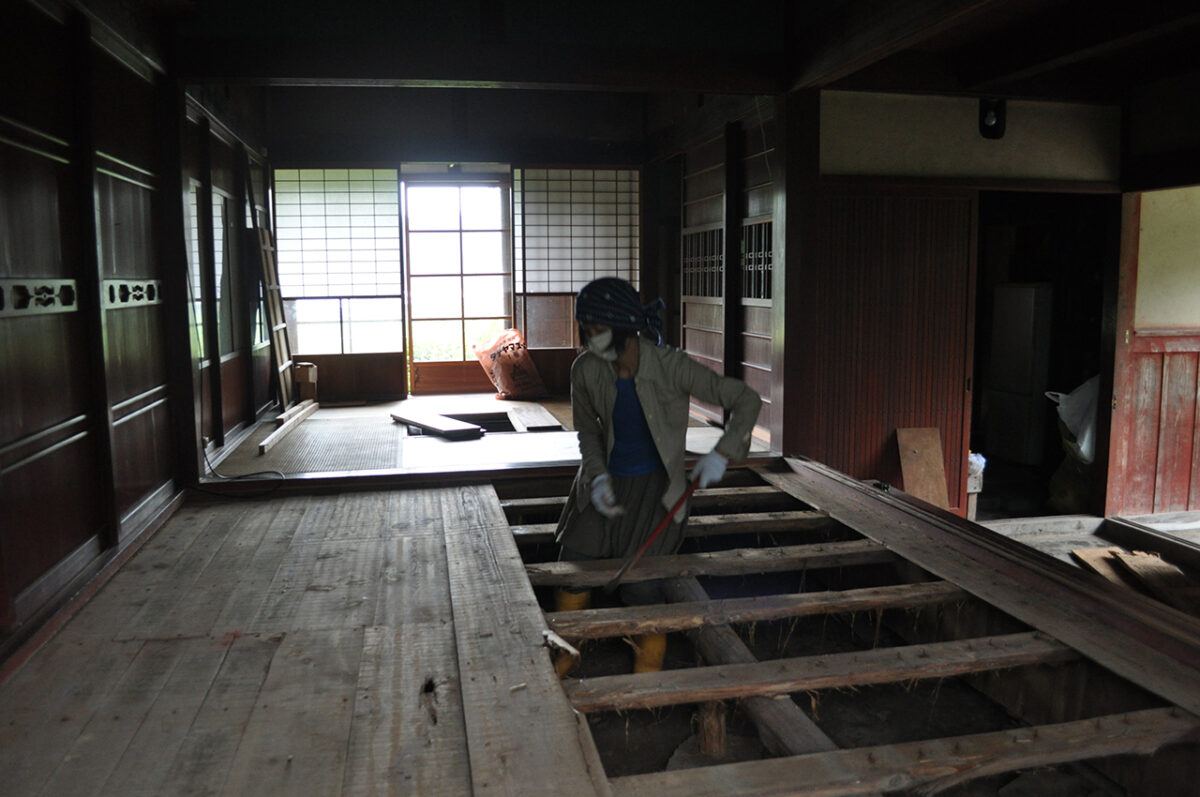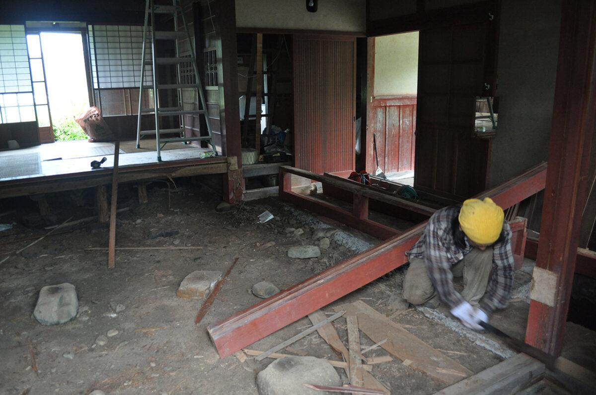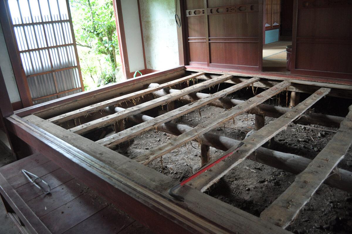 建具や畳を外して、さらにバールで野地板を剥がす。