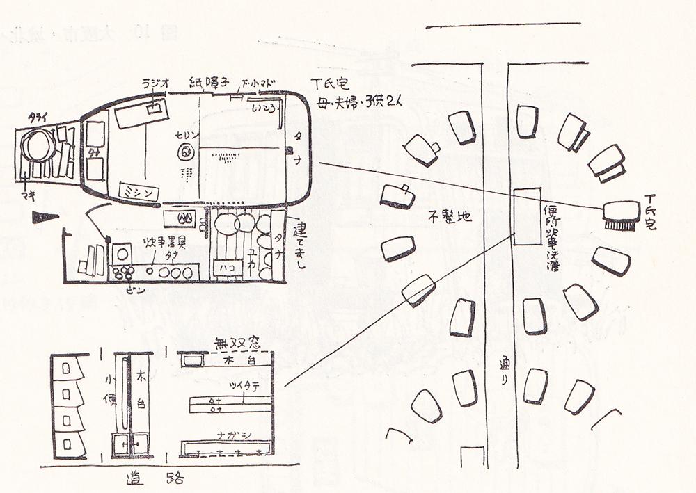 そんな転用事例の代表「バス住宅」の住まいぶりを、住宅営団を辞めて京都大学助教授に就いていた西山夘三が記録している【図10】。1950(昭和25)年に採集した大阪・城北バス住宅は、中央に建てられた共同炊事所・便所を囲むように、円環状に廃バスが配置されたもの。前川國男が「プレモス」による労働者集合住宅でもって示した「家事が共同化され、社会化される」姿が否応なしの現実として立ちあがる。危機が「おいえ」をふるい落とす。