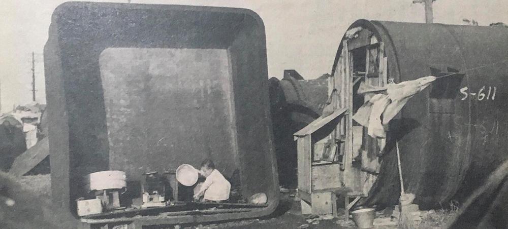 敗戦から6年後の1951(昭和26)年の雑誌記事には、市内にゴロゴロ転がっていた鉄管に40世帯100人あまりが暮らす「鉄管部落」が紹介されている16。