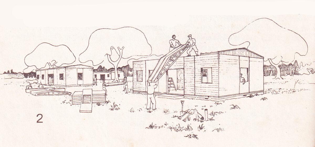 戦時中に住宅営団が手がけた組立家屋と同じく、プレカット材や木質パネルを現場で組み立てる方式が採られるも思うように実績は伸びない。さらに資材輸送の混乱や部品の盗難など問題山積となって建設は当初計画の3分の1にとどまった6。