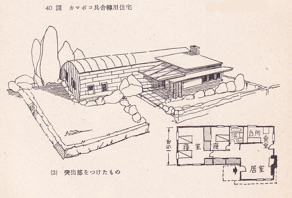 兵舎つながりでいえば、当時たくさん建てられた進駐軍の建物にカマボコ兵舎がある【図8】。名前の由来となったカマボコのような形状で大きな空間を確保できるため、住宅、事務所、店舗などにも対応したことから、戦後に払い下げられたて店舗や学校施設、公共施設へ転用された事例も多い。積水ハウスがプレハブ住宅を開発する際のデザインソースにもなった14。