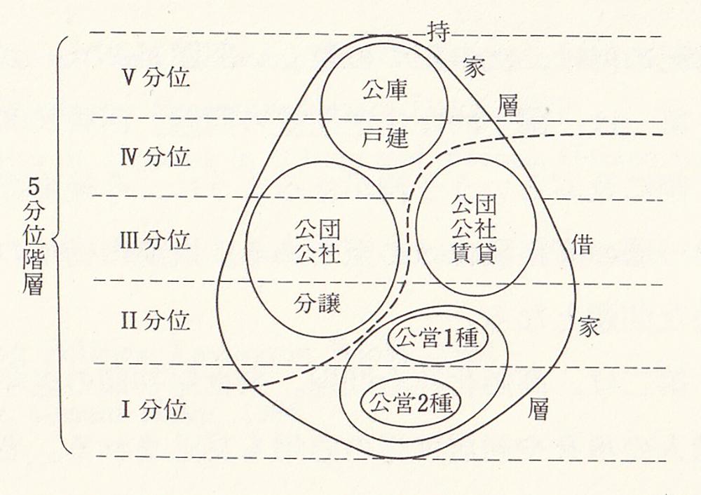 所得に応じて住宅供給の目標を設定した政策はごもっともながら、結果的に低所得者は借家、高所得者は持ち家、つまり「戸建て・持ち家」は勝ち組という「住宅階層」をつくりだすことになった。