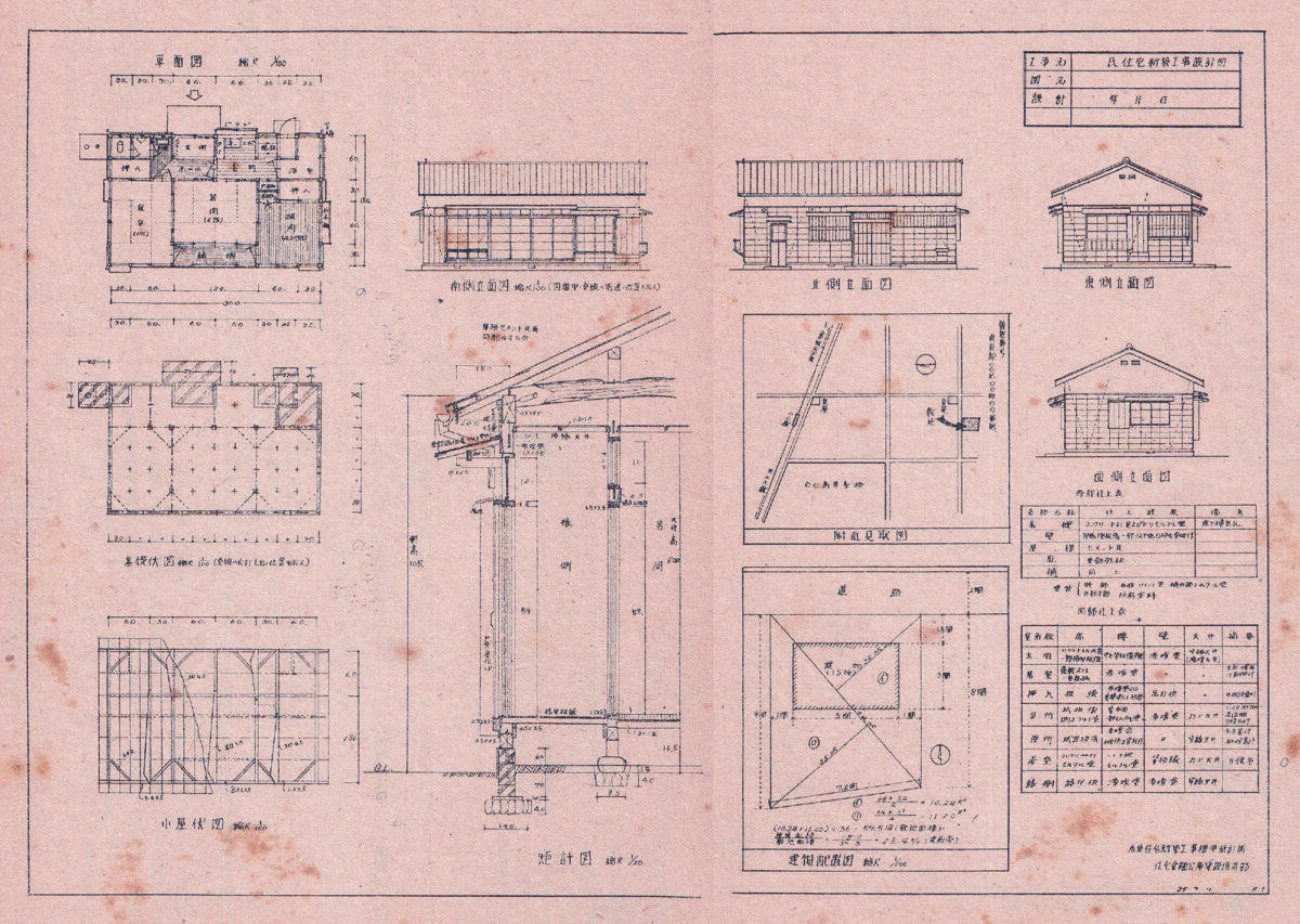 「標準住宅設計図」の内訳は「一般図面」と「矩計詳細図」で構成されていた。これに実際の建物配置図と附近見取図を添付すれば、「融資住宅建設審査基準」に適合し、そのまま融資申請のための設計図として利用できた【図4】。
