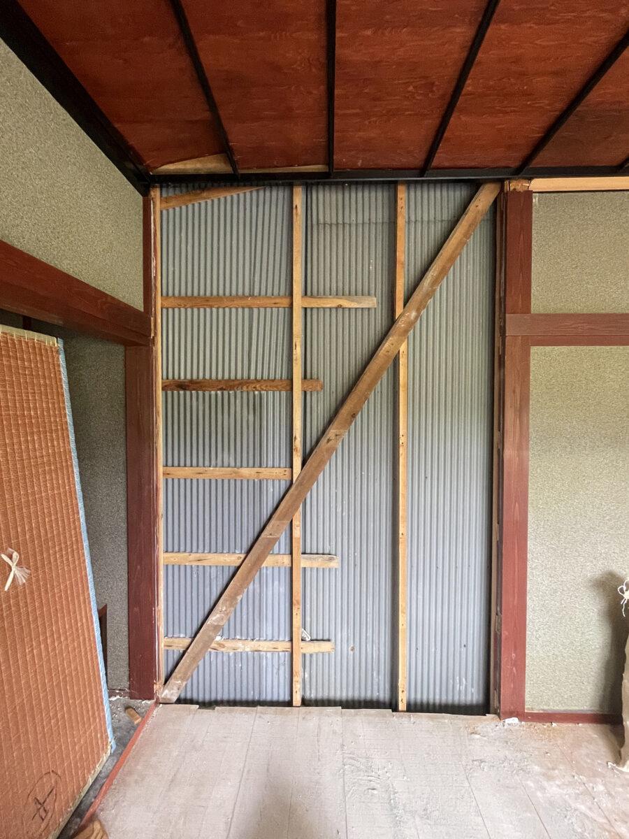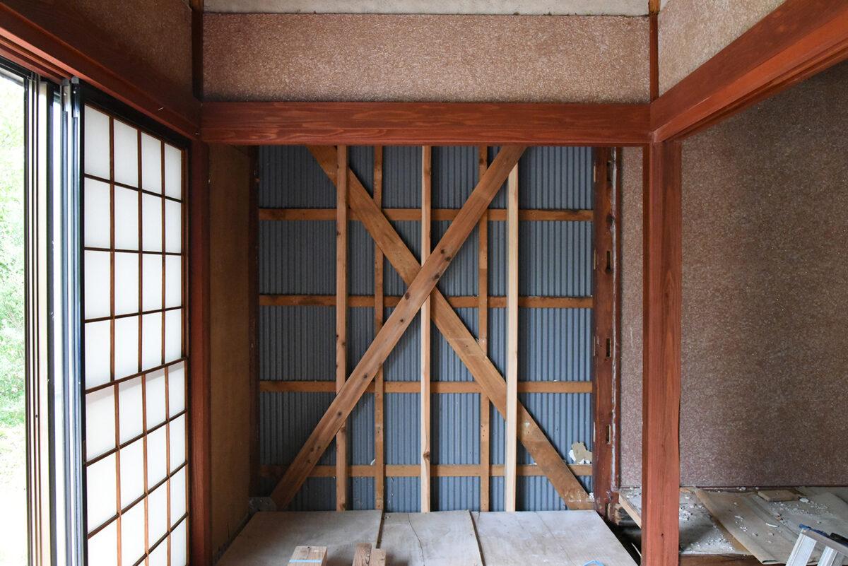 また今回は、既存の片筋交いが入っている壁を活かし、補強を追加しました。既存部材の劣化や、柱・梁・土台との接合状態によって効果は変わるため、施工前に状態確認を行い、必要に応じて補修や金物の追加も検討しましょう。