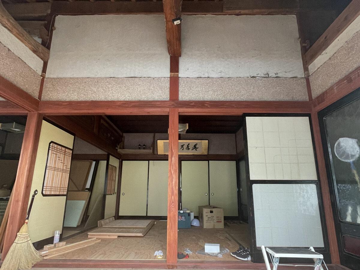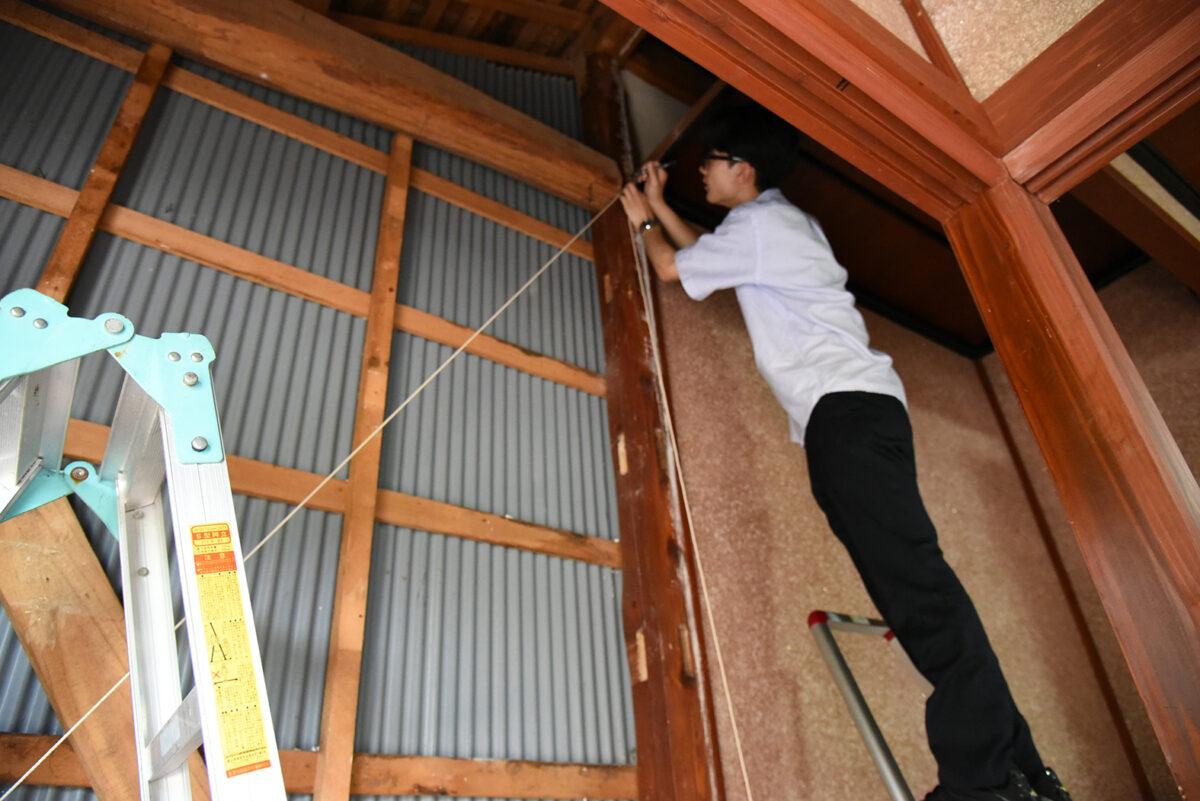 柱間の寸法と土台〜梁の高さを実測します。古い建物は、柱や梁が必ずしも直角・鉛直とは限らないため、左右・上下で複数箇所を測ると安心です。