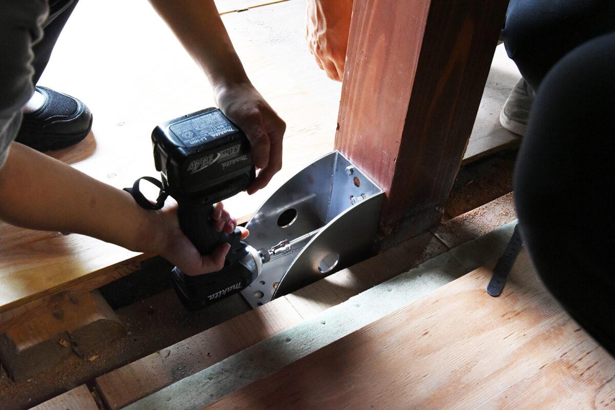 柱と横架材(土台・梁など)の接合部を確認し、必要に応じて専用金物を取り付けます。